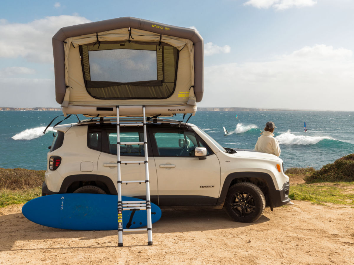 This lightweight, aluminum telescopic ladder with 9 adjustable rungs ensures easy access and stability, featuring an automatic lock and non-slip feet. Extending to 8'6" and folding to a compact size, it's ideal for multiple vehicles and integrates seamlessly with rooftop tents. Often bought as an additional ladder for the GT SKY LOFT's second entrance.